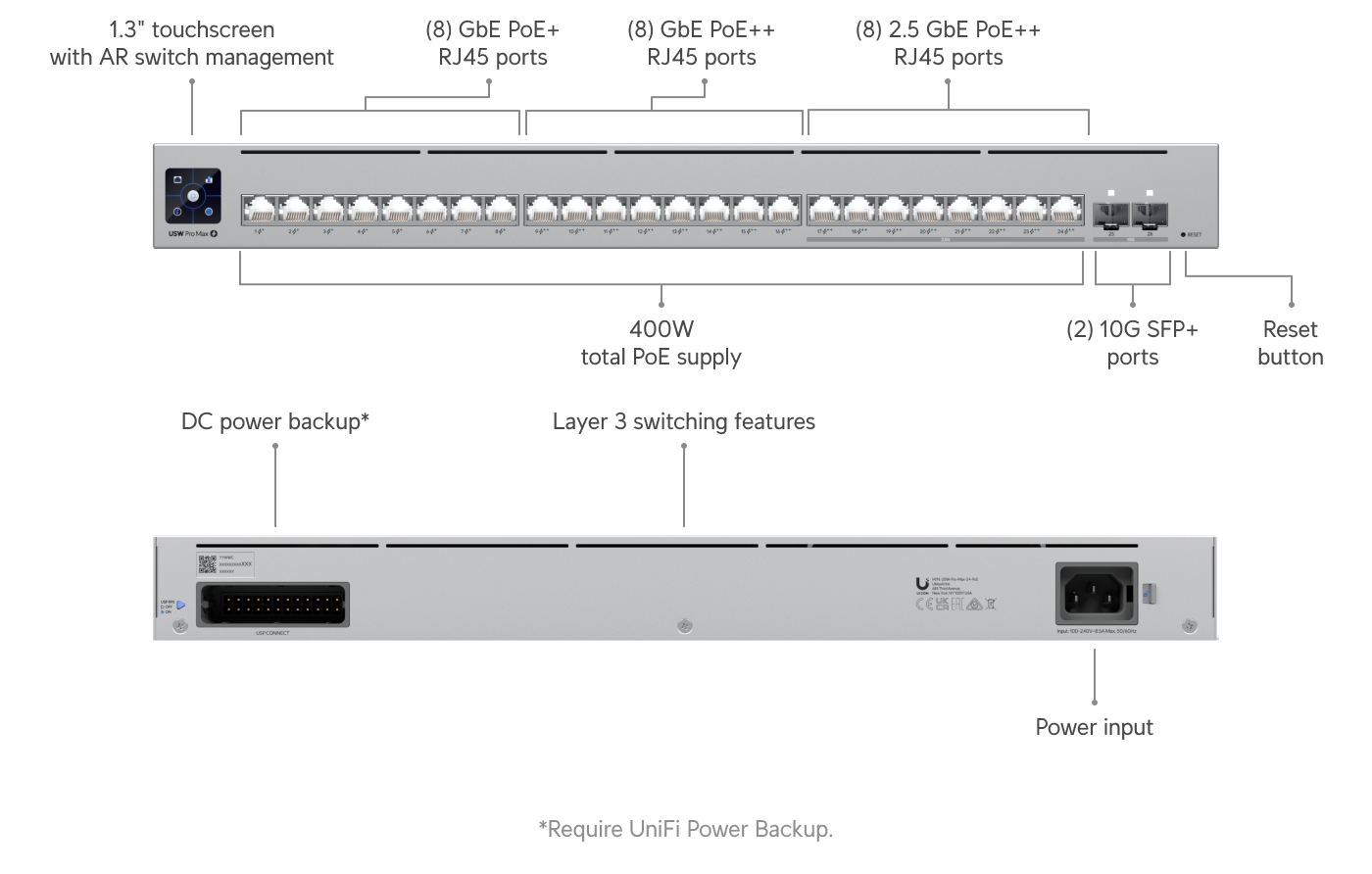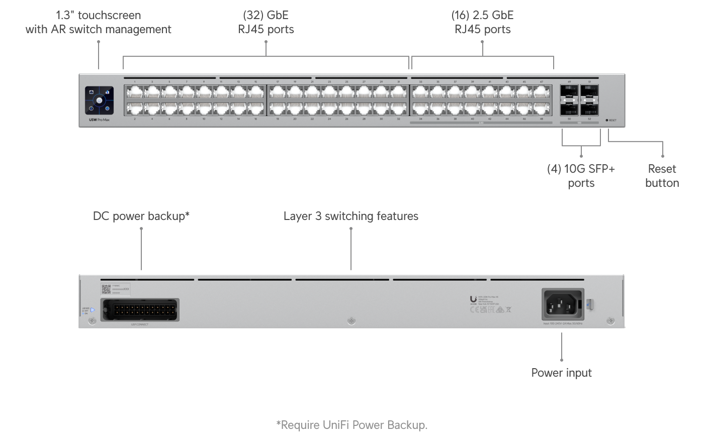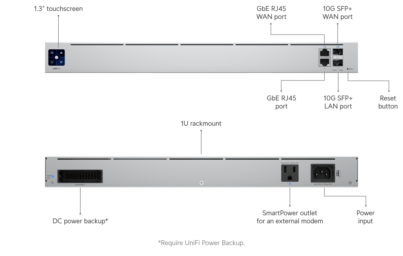 10G multi-WAN independent gateway with UniFi Power Backup support designed to protect large-scale networks.