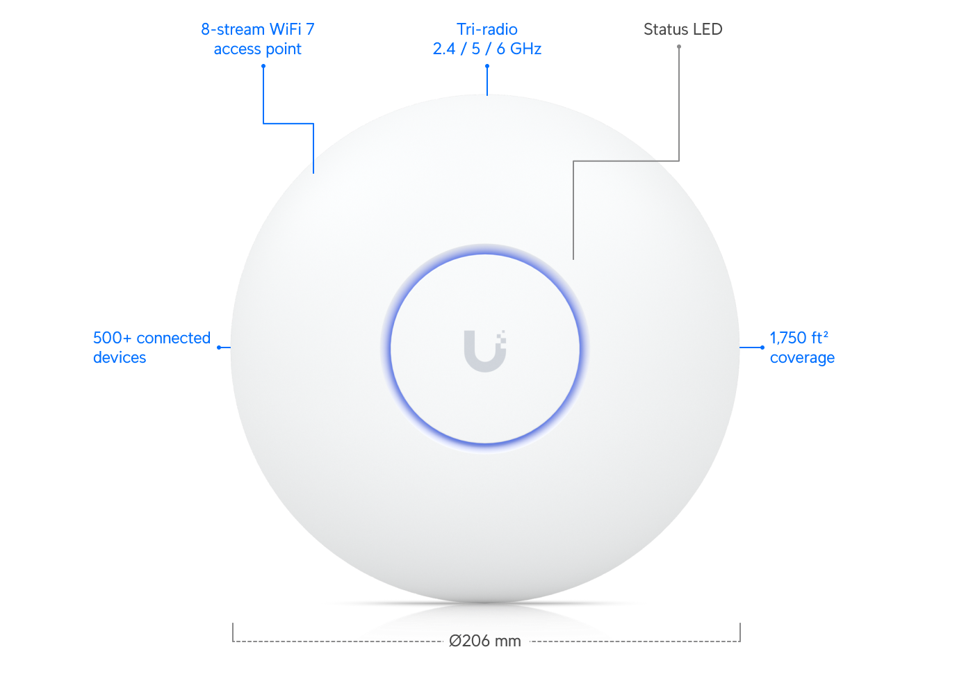 Compact, ceiling-mount WiFi 7 AP with 5 spatial streams and extended signal range.