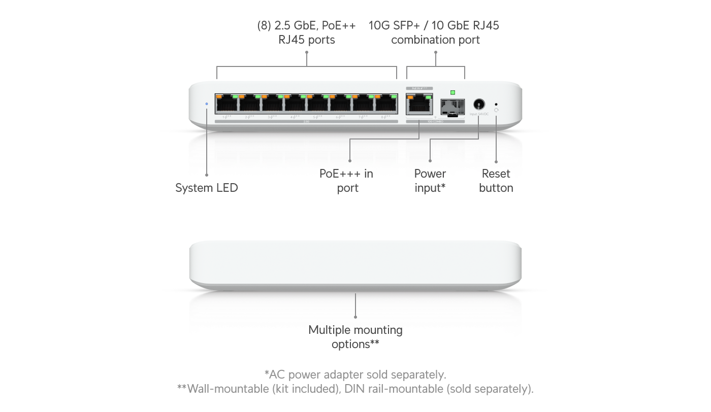 Flexible, 8-port 2.5 GbE PoE++ switch with a 10 GbE RJ45/SFP+ combination uplink port that can be powered with PoE+++ or an AC power adapter.